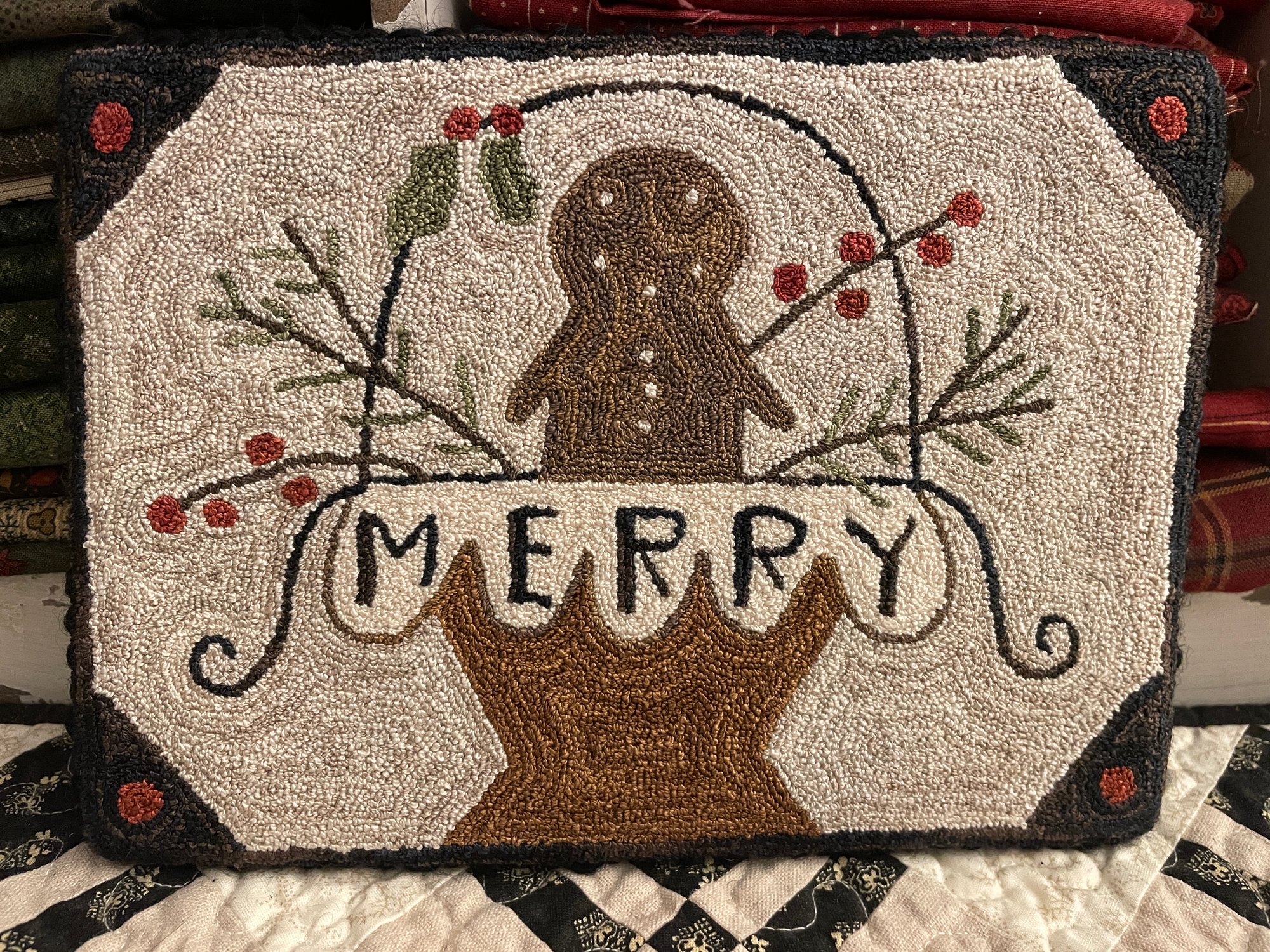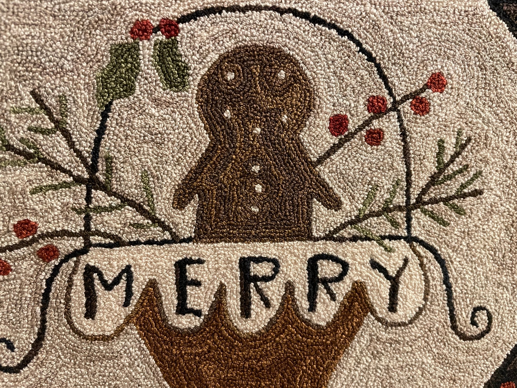 Merry Gingerbread Man Basket Primitive Punch Needle Decorative Folk Art Mat/Mini Rug~~